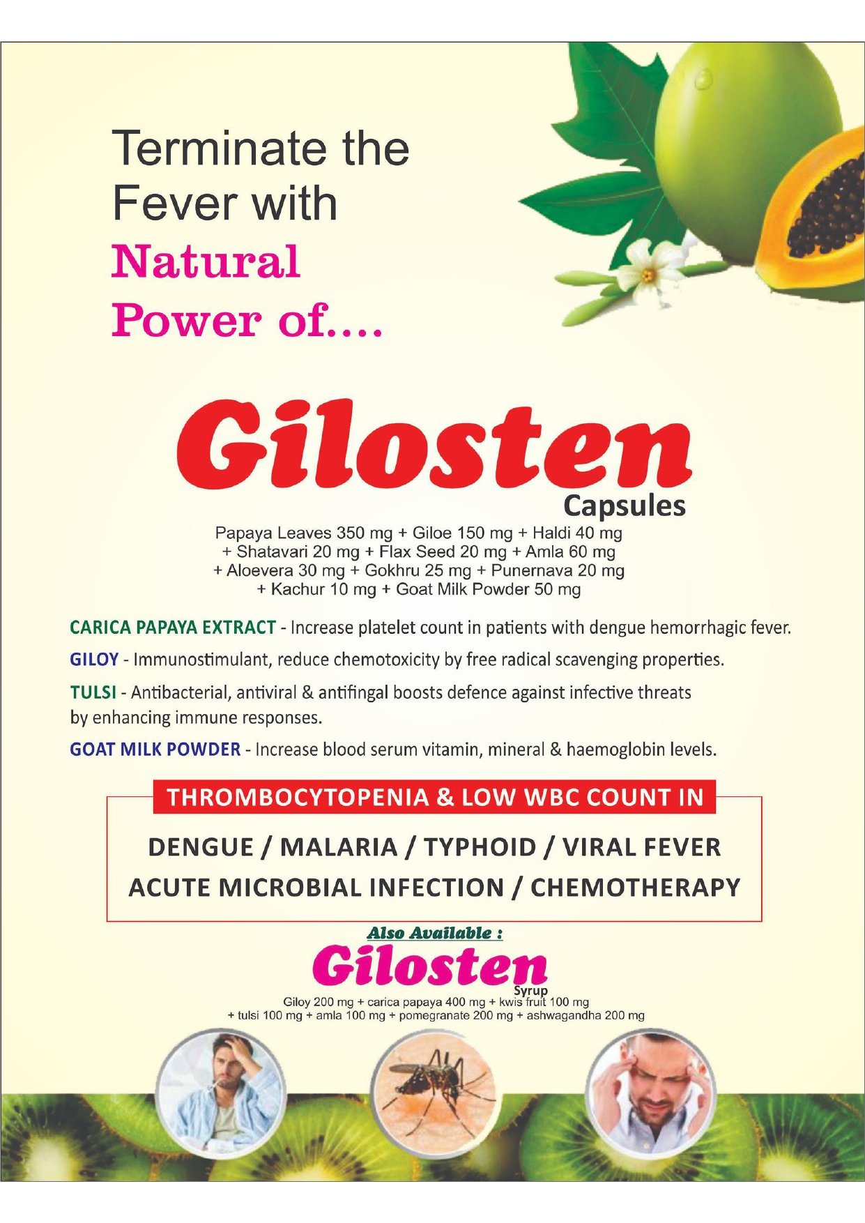 GILOY 200MG + CARICA PAPAYA 400MG + KIWI FRUIT 100 MG + TULSI 100MG + AMLA 100MG + POMEGRANATE 200 MG + ASHWAGANDHA 200MG